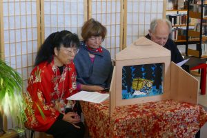 Zu den Märchentagen 2025 der Stadt Bad Säckingen zeigte unsere Gesellschaft ein Kamishibai in der Stadtbücherei. Kaoru Stocker, die das Märchen „Das zungenlose Spätzchen“ sowohl auf Japanisch wie auf Deutsch – letzteres gemeinsam mit Renate Grießer und Peter Haußmann – zeigte, wurde von Kindern und erstaunlich vielen Erwachsenen verfolgt.